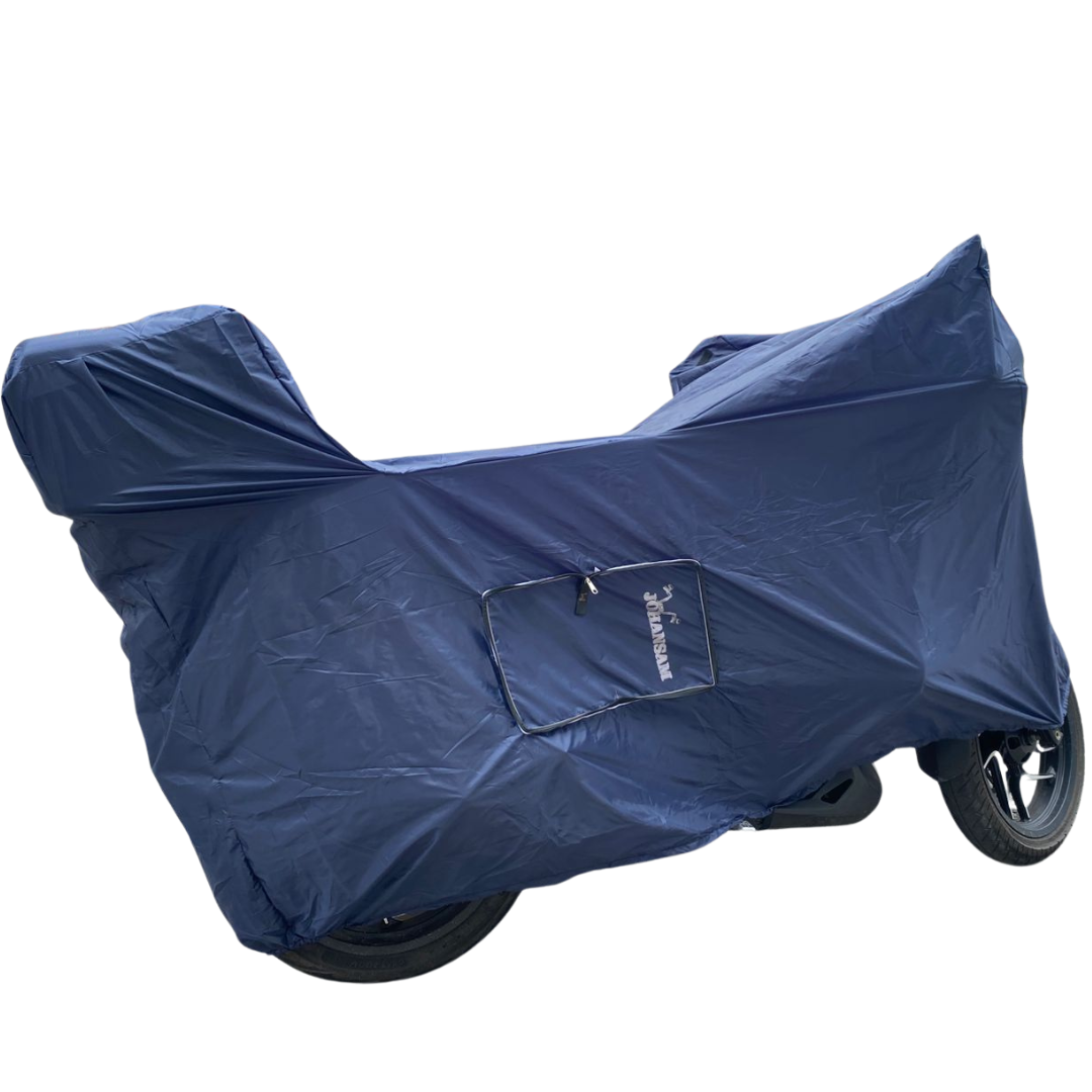 Si tu moto duerme en la calle o en un garaje sin techo, esta pijama para moto en tela tafeta es la solución ideal para cuidarla todos los días. Está fabricada con el mismo material de las sombrillas, por eso es ligera, resistente y semi impermeable.